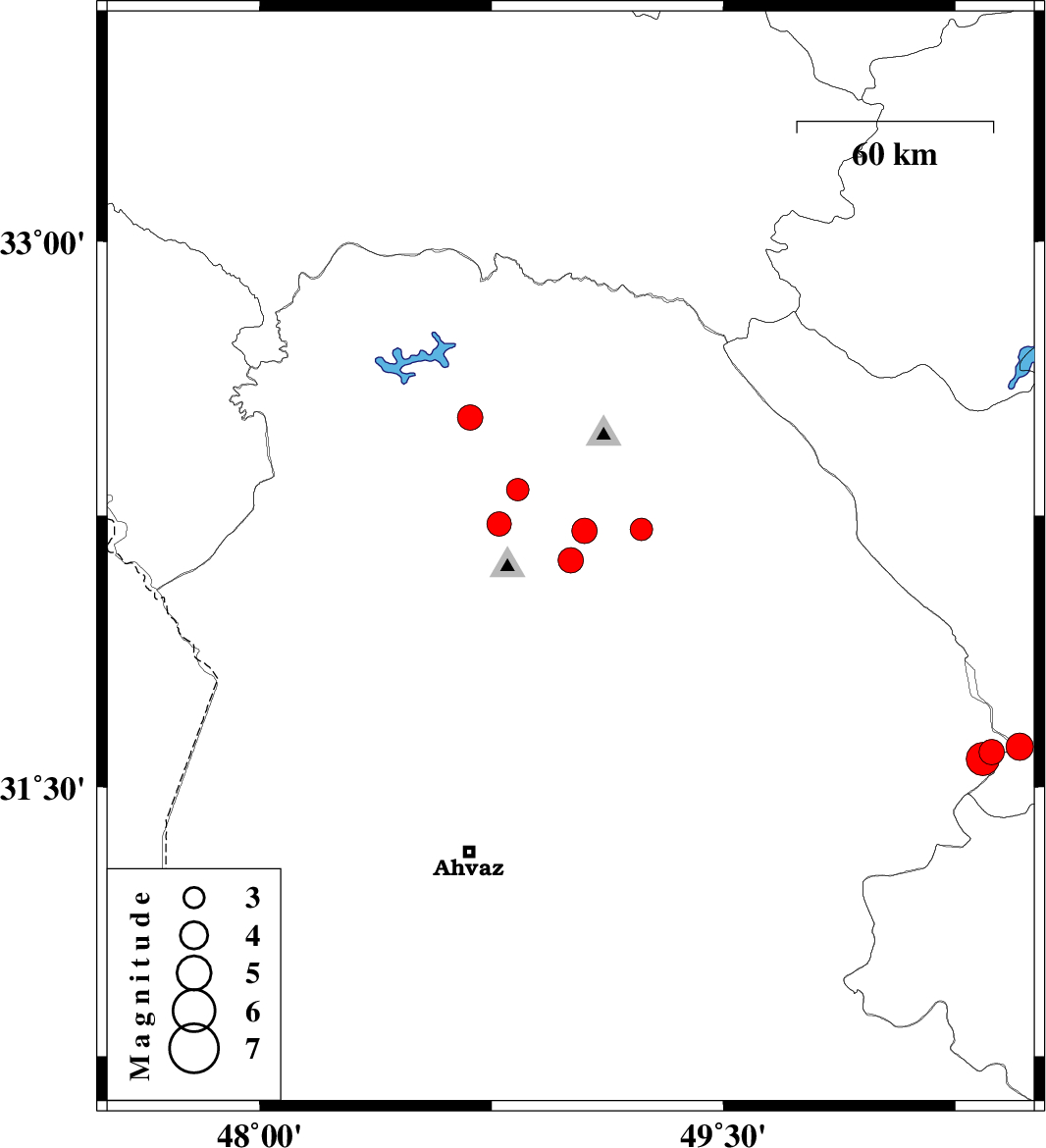 | 2022/04/25 | 07:39:24.3 | 12:09:24.3 | 32.519 | 48.681 | 12 | ML:3.6 | Khoozestan Province, 32 km -East of Andimeshk |