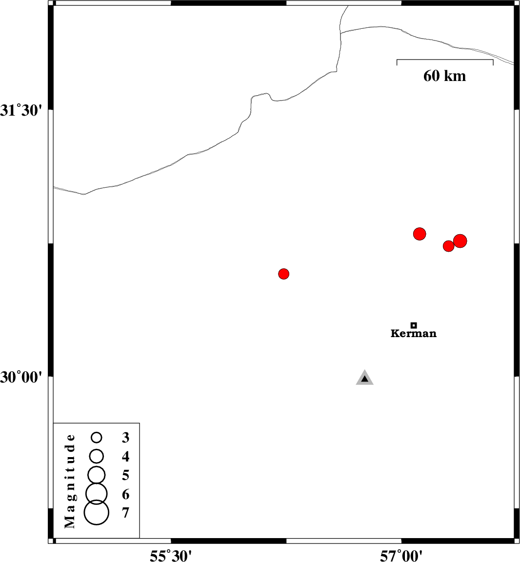| 2022/05/26 | 12:34:30.2 | 17:04:30.2 | 30.763 | 57.381 | 12 | ML:3.9 | Kerman Province, 60 km North-East of Kerman |