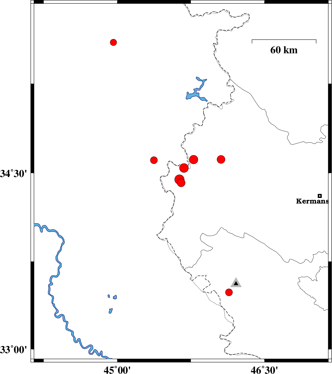 | 2022/05/13 | 16:42:45.3 | 21:12:45.3 | 34.614 | 46.057 | 12 | ML:3.6 | Kermanshah Province, 23 km North-East of Sar-e pol-e zahab | ||