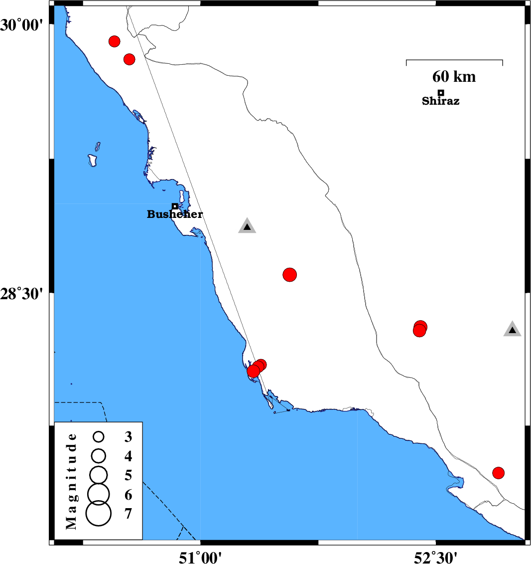 | 2022/05/21 | 15:03:09.1 | 19:33:09.1 | 28.082 | 51.366 | 12 | ML:3.4 | , 63 km South of Khormog | ||