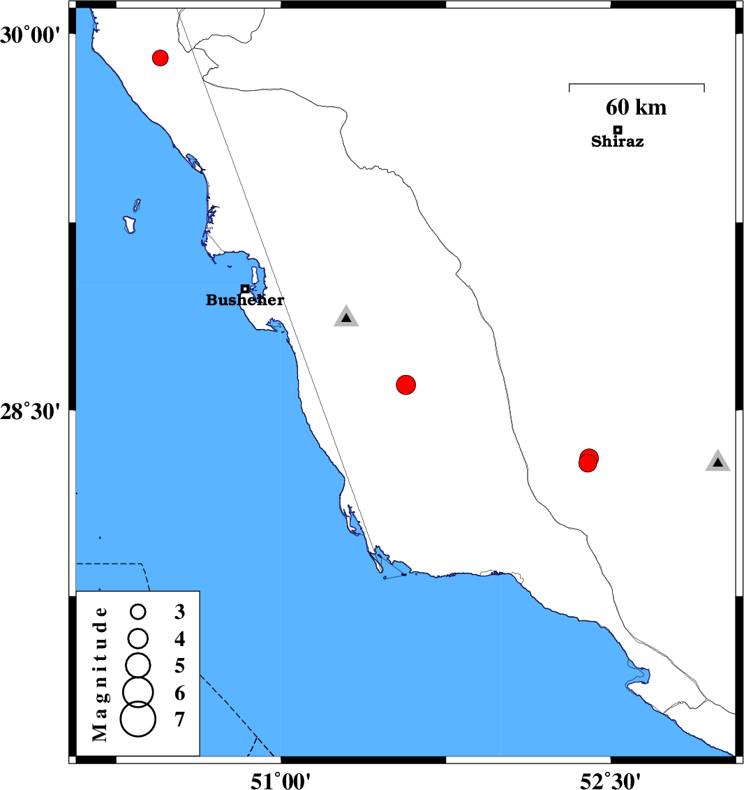 | 2022/06/02 | 06:53:25.8 | 11:23:25.8 | 28.287 | 52.396 | 9 | ML:3.7 | Fars Province, 51 km North of Jam | ||
