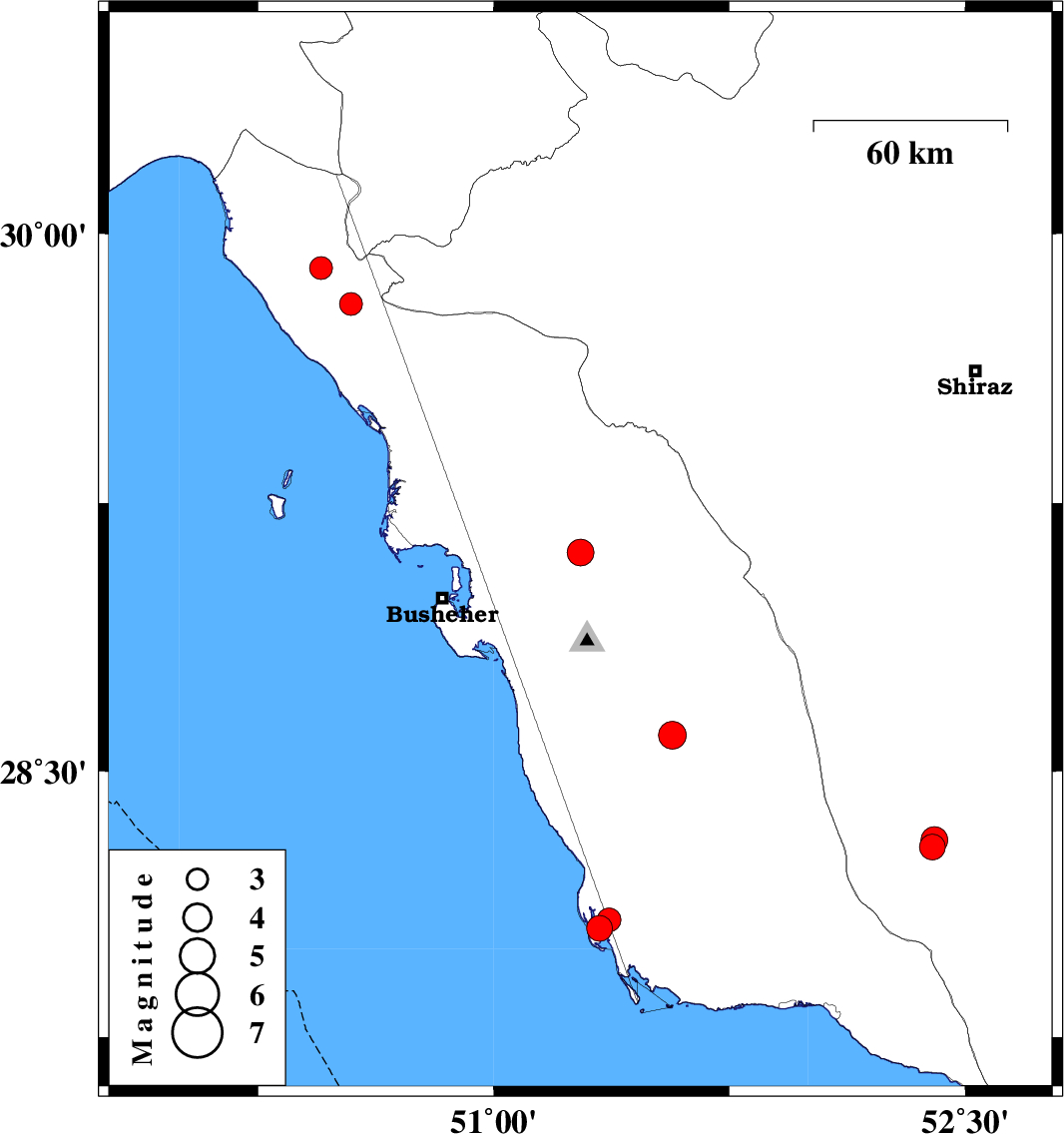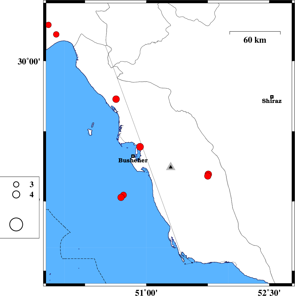 | 2022/05/21 | 15:03:09.1 | 19:33:09.1 | 28.082 | 51.366 | 12 | ML:3.4 | , 63 km South of Khormog |
