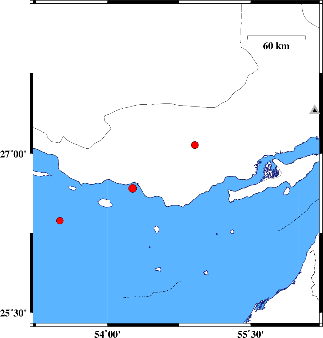 2022/06/14 | 14:09:42.1 | 18:39:42.1 | 26.654 | 54.258 | 12 | ML:4.4 | Persian Gulf, 61 km South-West of Bastak | ||
