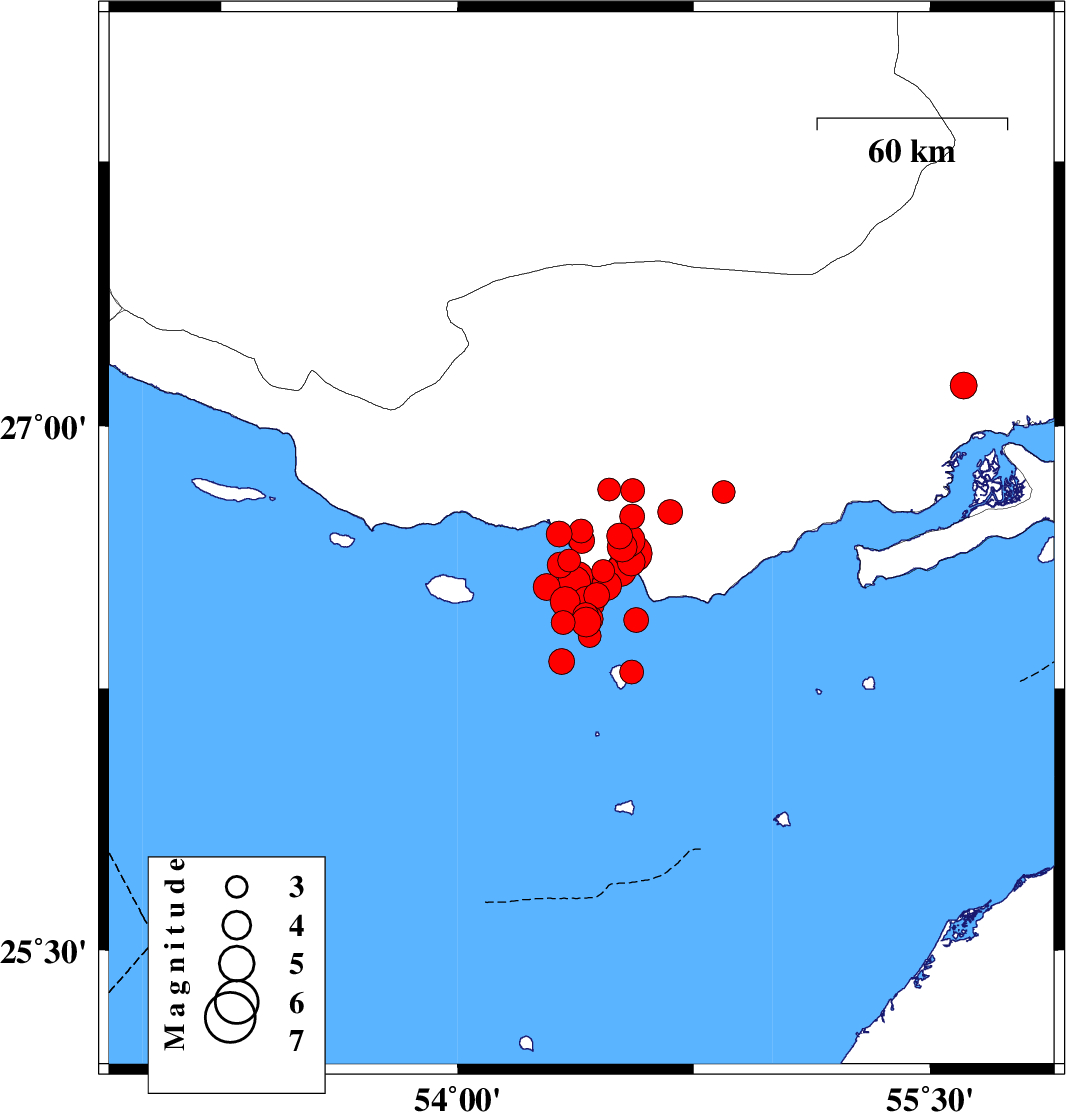 2022/06/15 19:53:54.8 00:23:54.8 26.68954.20212 ML:3.6 Persian Gulf, 59 km South-West of Bastak
