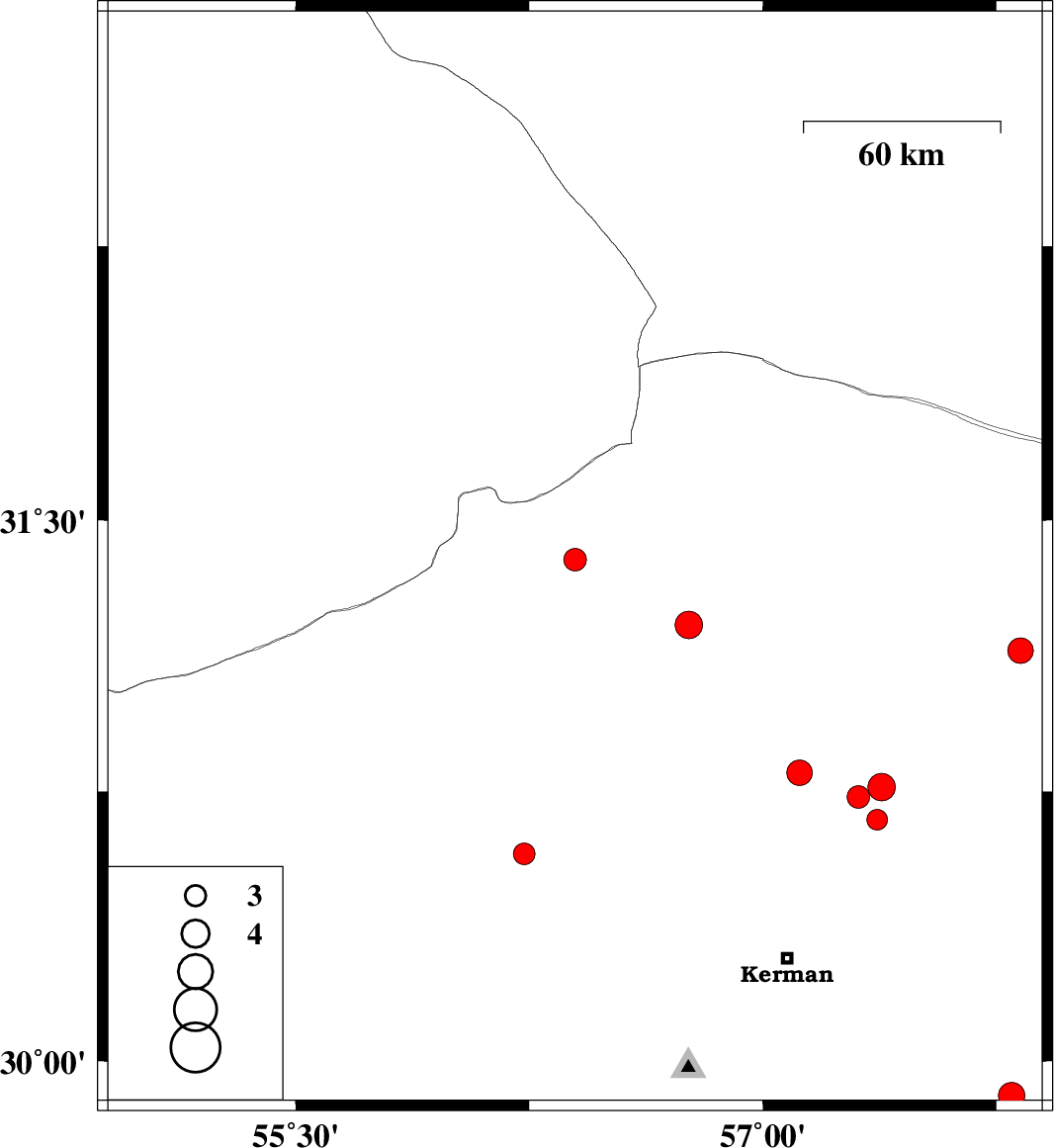 | 2022/05/26 | 12:34:30.2 | 17:04:30.2 | 30.763 | 57.381 | 12 | ML:3.9 | Kerman Province, 60 km North-East of Kerman | ||