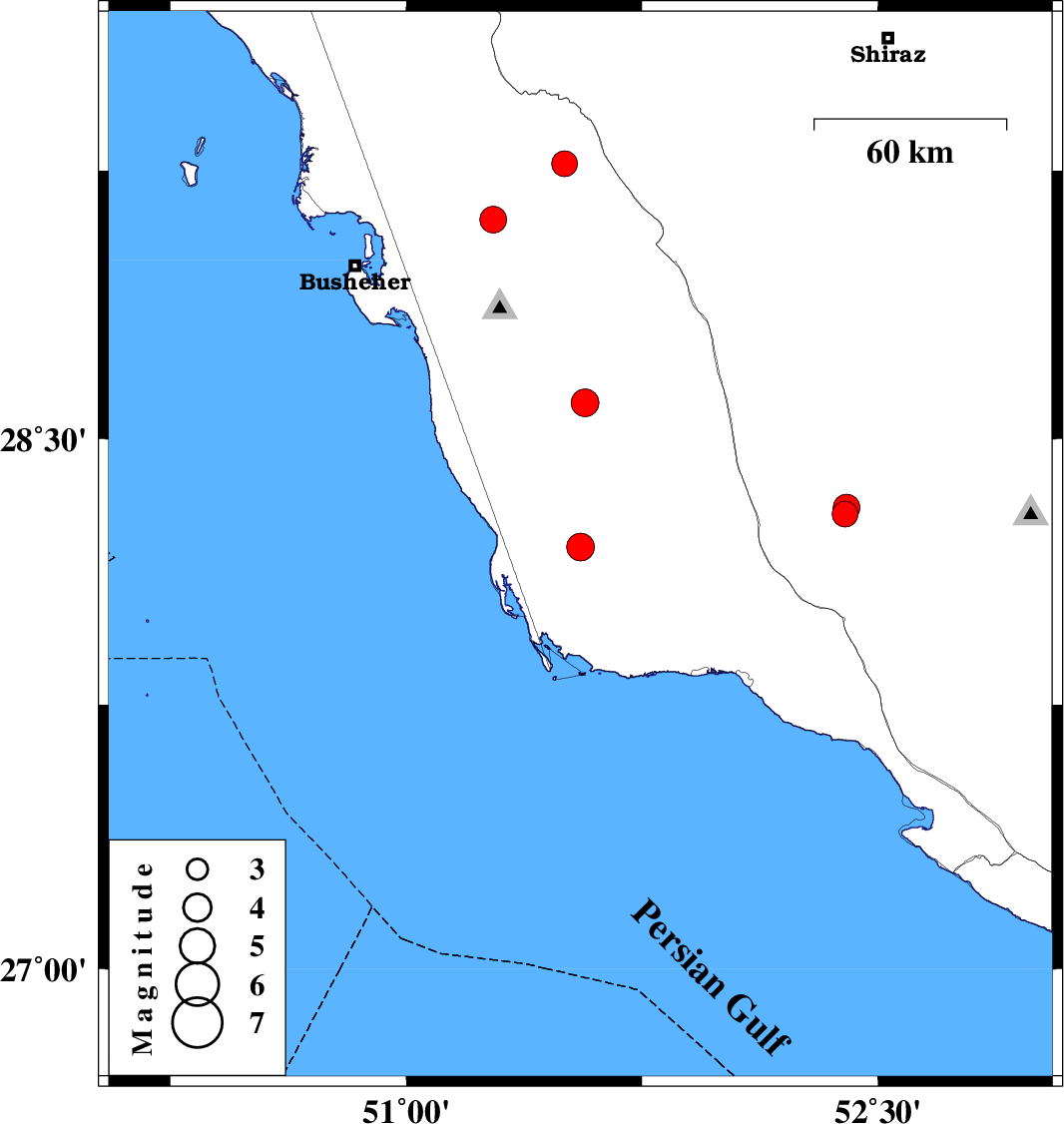 | 2022/06/02 | 06:53:25.8 | 11:23:25.8 | 28.287 | 52.396 | 9 | ML:3.7 | Fars Province, 51 km North of Jam | ||