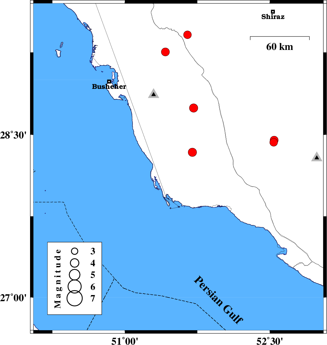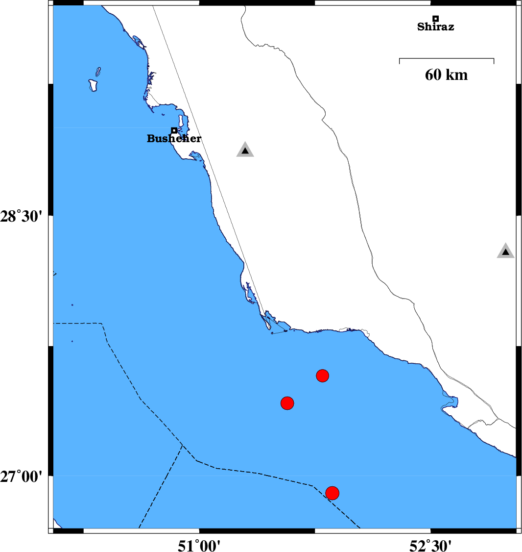 | 2022/06/24 | 06:34:39.7 | 11:04:39.7 | 29.269 | 51.504 | 12 | ML:3.6 | Bushehr Province, 29 km -East of Borazjan | ||