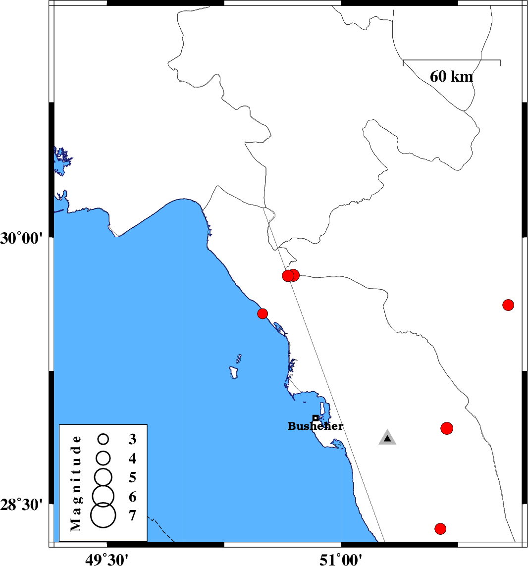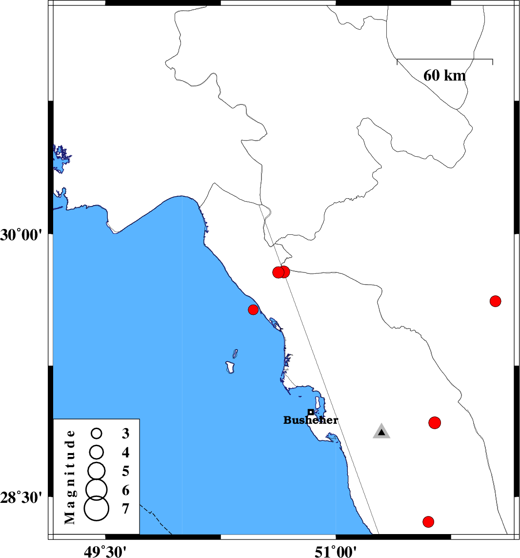 | 2022/08/06 | 03:43:59.5 | 08:13:59.5 | 29.784 | 50.66 | 12 | ML:3.5 | Bushehr Province, 27 km North-East of Bandar-e genaveh | ||