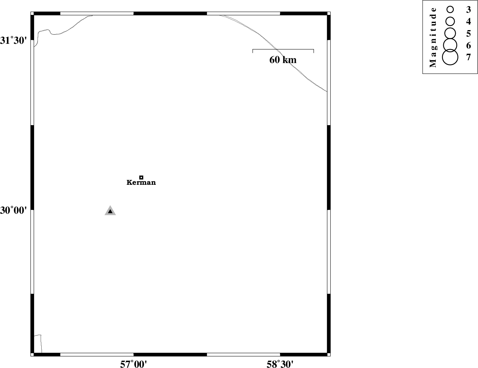 | 2022/08/15 | 03:31:58.5 | 08:01:58.5 | 31.099 | 57.432 | 12 | ML:4.2 | Kerman Province, 62 km South-East of Ravar | ||