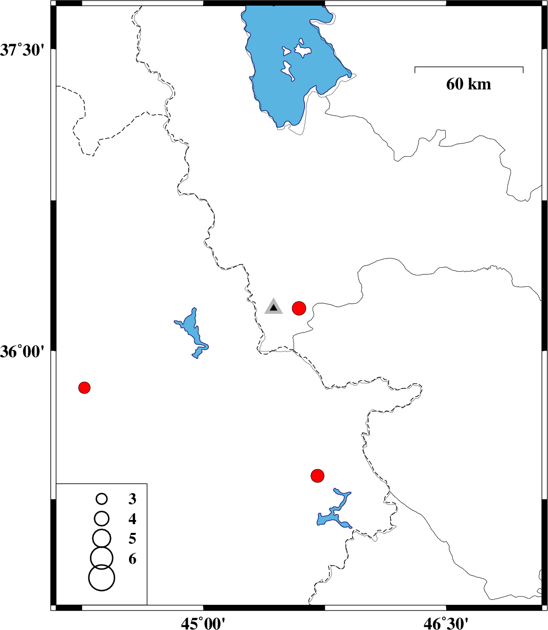 | 2022/08/27 | 04:25:22.8 | 08:55:22.8 | 36.212 | 45.59 | 12 | ML:3.8 | Azarbaijan Gharbi Province, 13 km -East of Sardasht | ||