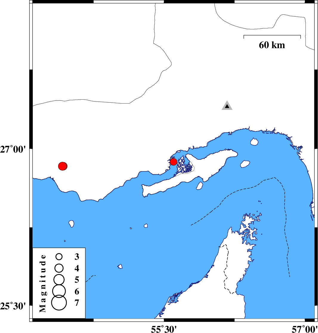 | 2022/08/24 | 21:53:08.2 | 02:23:08.2 | 26.875 | 55.601 | 12 | ML:3.4 | Persian Gulf, 67 km -West of Qeshm | ||