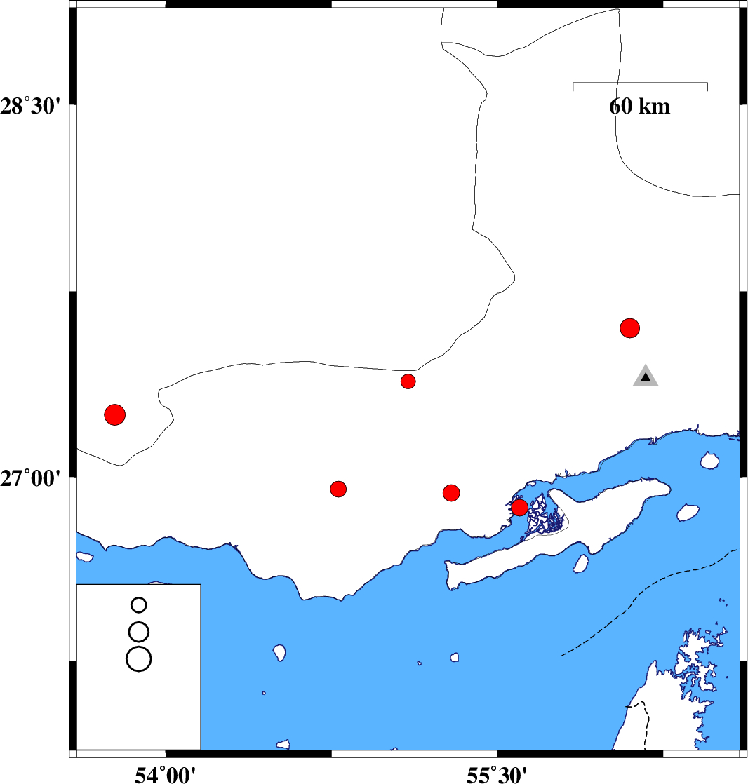 | 2022/08/27 | 14:29:33.1 | 18:59:33.1 | 26.935 | 55.291 | 20 | ML:3.4 | Hormozgan Province, 63 km North-East of Bandar-e lengeh | ||