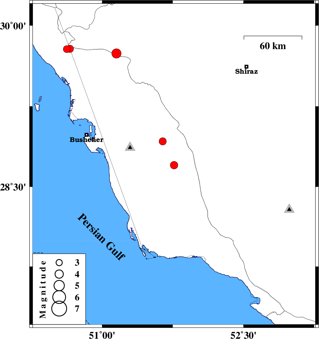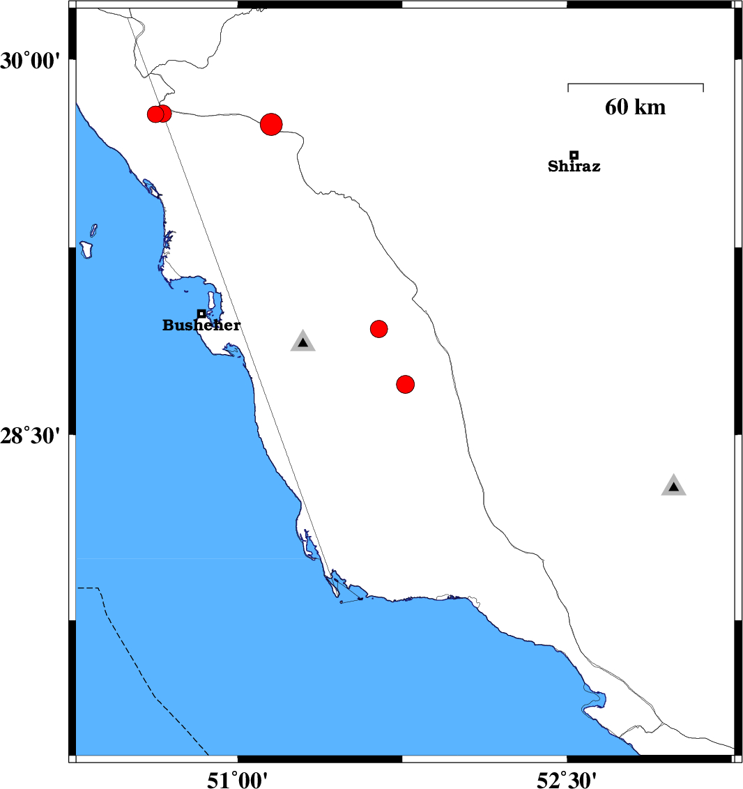 | 2022/08/06 | 03:43:59.5 | 08:13:59.5 | 29.784 | 50.66 | 12 | ML:3.5 | Bushehr Province, 27 km North-East of Bandar-e genaveh | ||