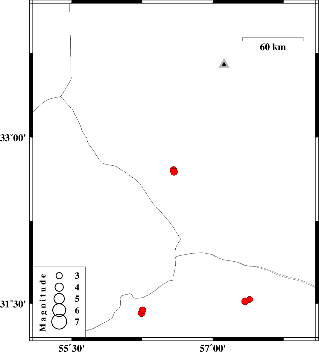 | 2022/08/27 | 06:41:43.1 | 11:11:43.1 | 31.538 | 57.392 | 12 | ML:3 | Kerman Province, 63 km North-East of Ravar | ||