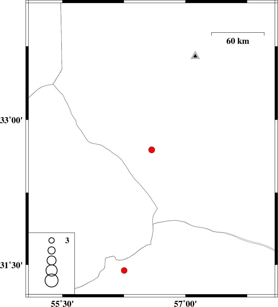2022/09/04 | 00:59:46.2 | 05:29:46.2 | 31.441 | 56.254 | 12 | ML:3.2 | Kerman Province, 56 km North-West of Ravar |
