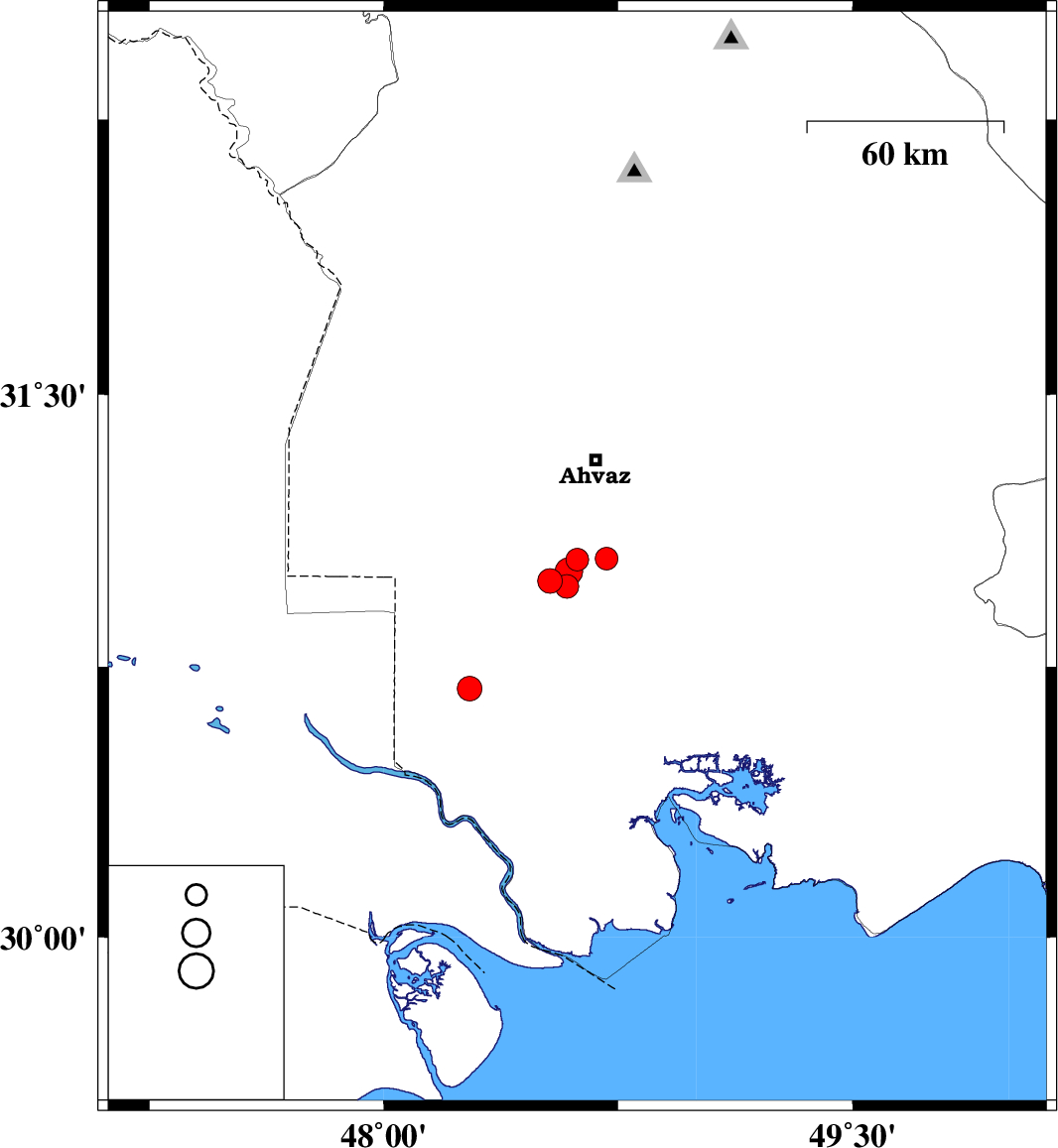 | 2022/08/25 | 19:58:31.1 | 00:28:31.1 | 30.69 | 48.274 | 12 | ML:3.5 | Khoozestan Province, 30 km North of Khorramshahr |