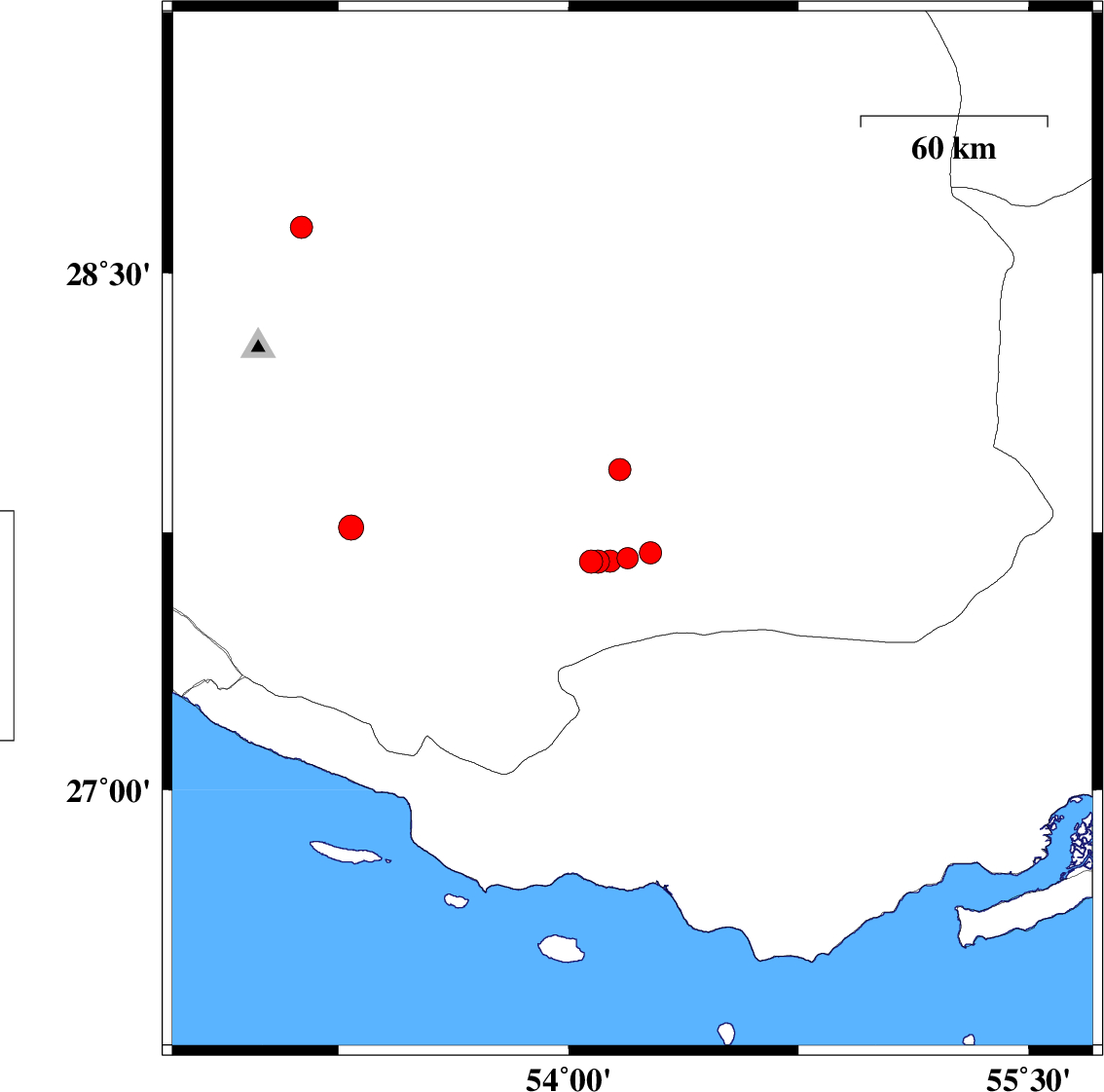 | 2022/09/14 | 20:20:49.3 | 00:50:49.3 | 26.778 | 55.154 | 15 | ML:3.4 | Hormozgan Province, 41 km North-East of Bandar-e lengeh | ||