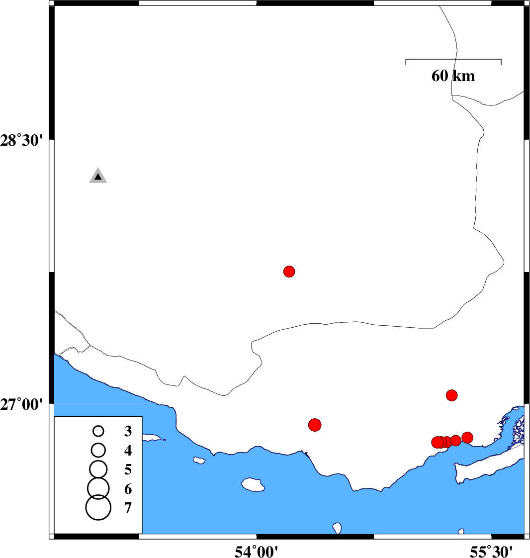 | 2022/09/14 | 01:54:39.1 | 06:24:39.1 | 26.878 | 54.371 | 12 | ML:3.7 | Hormozgan Province, 36 km South of Bastak |