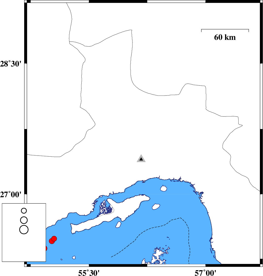 | 2022/09/14 | 20:20:49.3 | 00:50:49.3 | 26.778 | 55.154 | 15 | ML:3.4 | Hormozgan Province, 41 km North-East of Bandar-e lengeh | ||