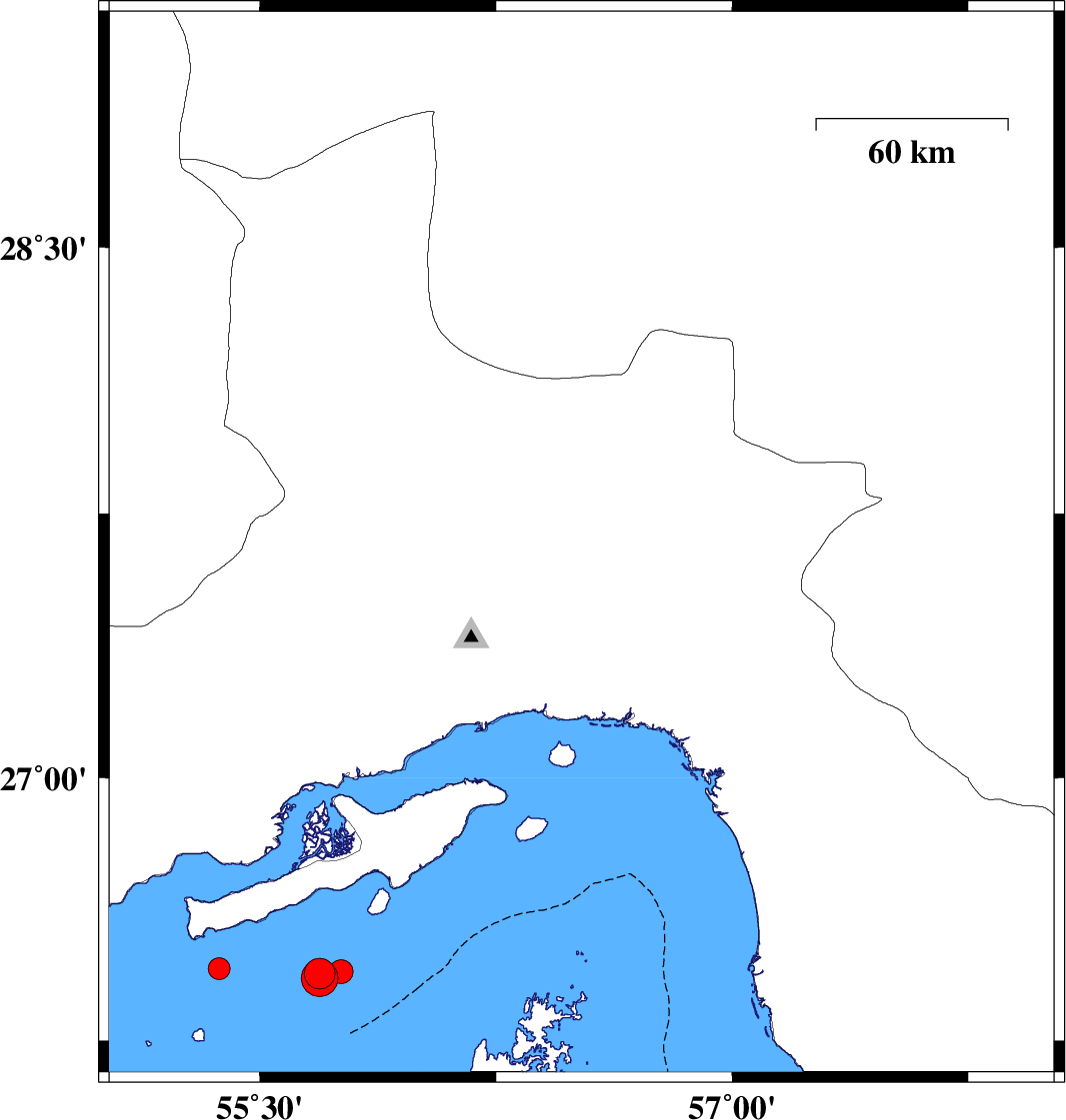 | 2022/09/21 | 05:28:18.1 | 09:58:18.1 | 26.796 | 55.353 | 12 | ML:3.6 | Hormozgan Province, 58 km North-East of Bandar-e lengeh | ||
