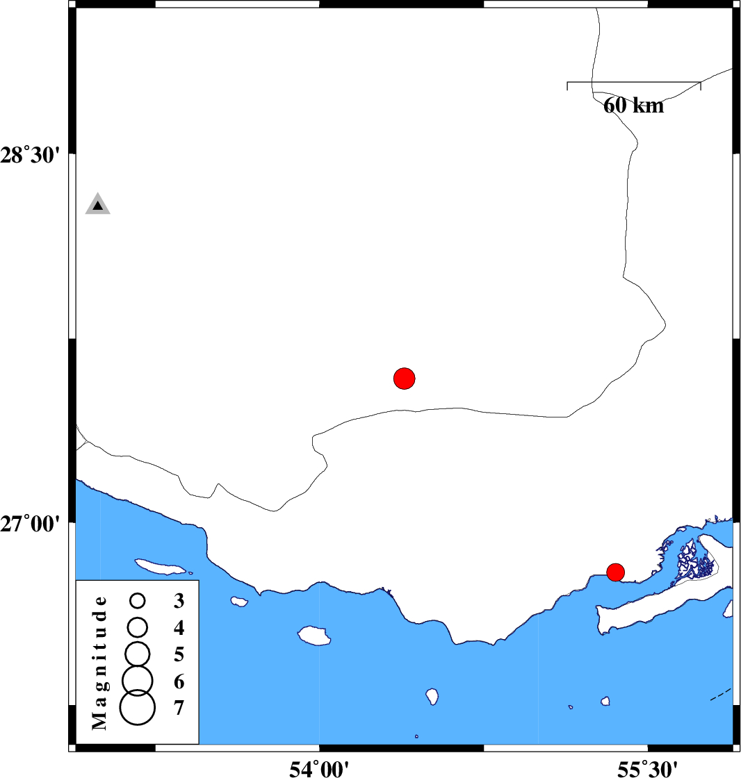 | 2022/09/21 | 05:28:18.1 | 09:58:18.1 | 26.796 | 55.353 | 12 | ML:3.6 | Hormozgan Province, 58 km North-East of Bandar-e lengeh |