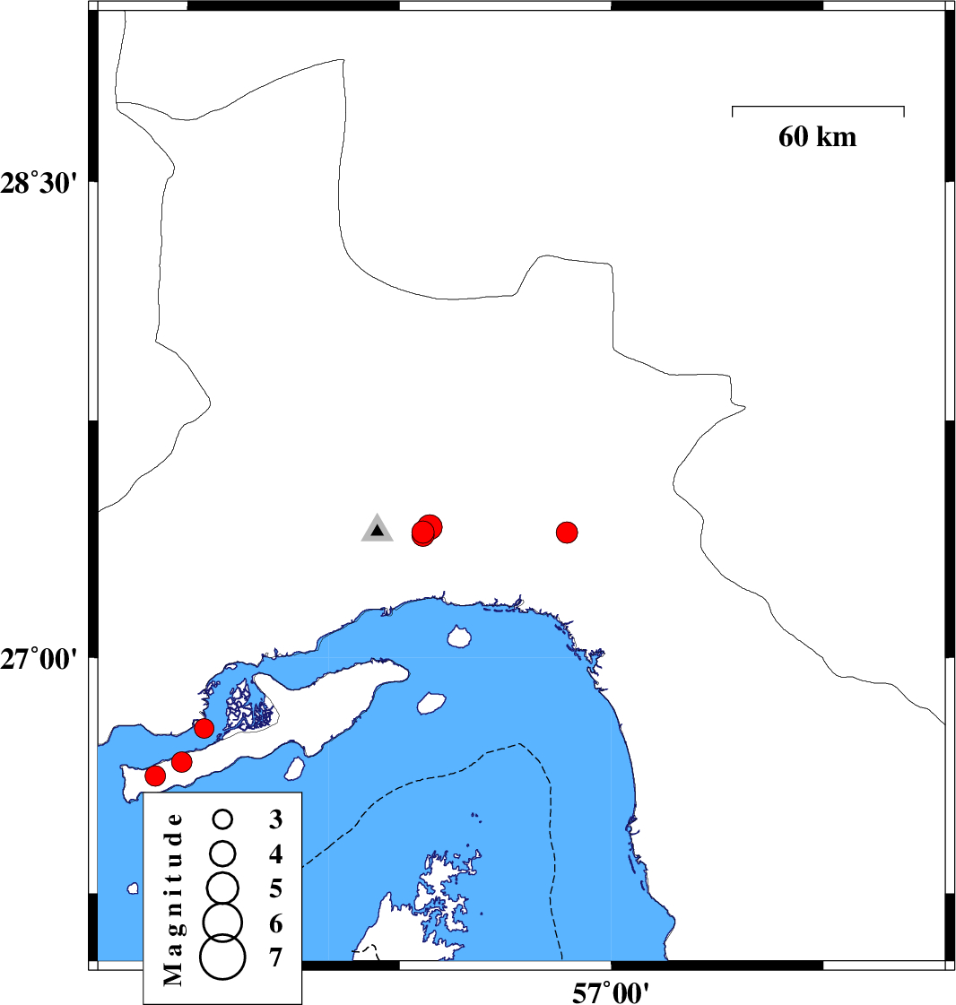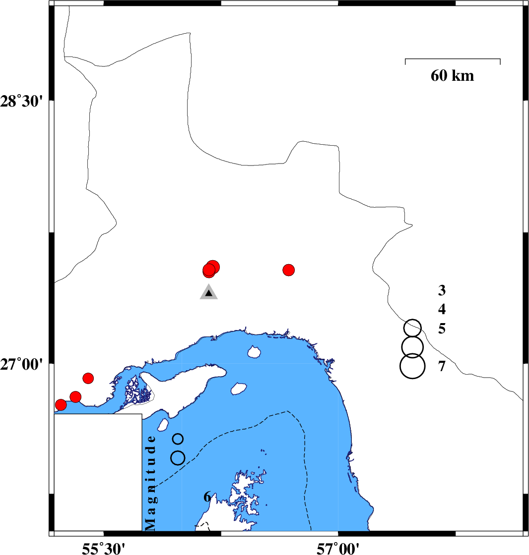 | 2022/10/04 | 01:02:59.3 | 04:32:59.3 | 26.763 | 55.225 | 12 | ML:3.2 | Hormozgan Province, 46 km North-East of Bandar-e lengeh |