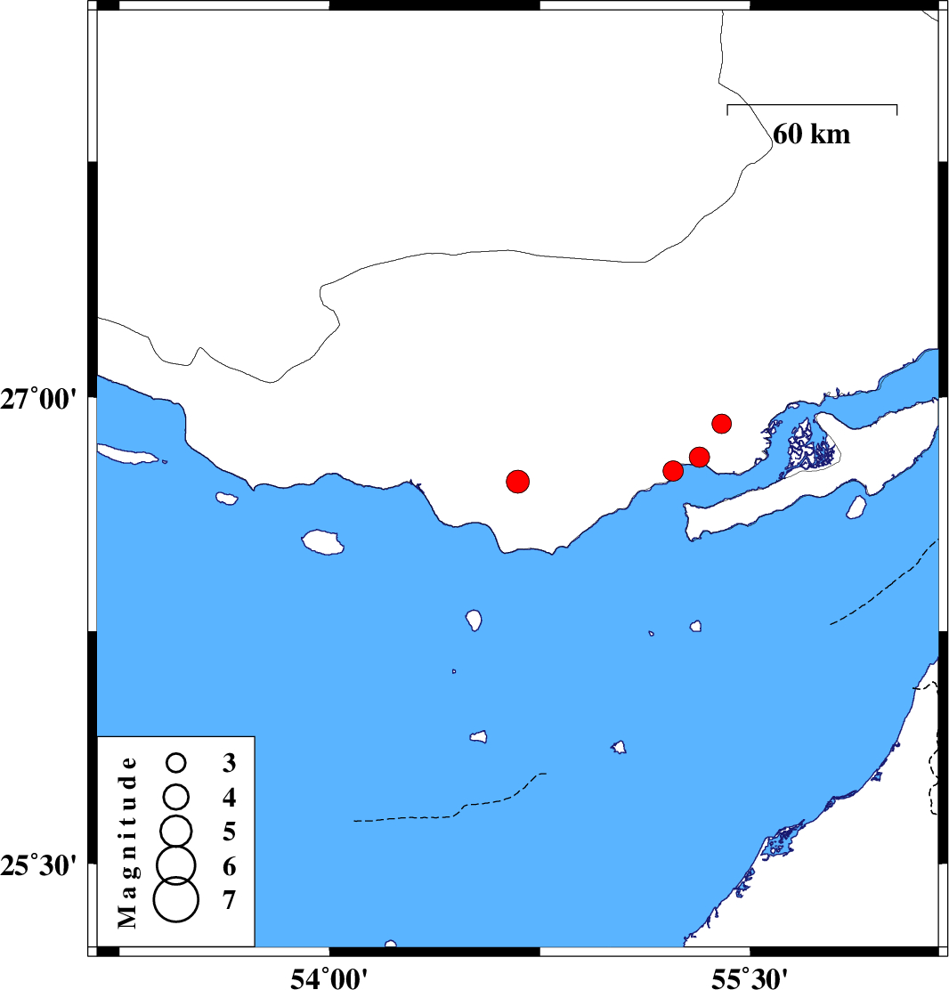 | 2022/10/04 | 01:02:59.3 | 04:32:59.3 | 26.763 | 55.225 | 12 | ML:3.2 | Hormozgan Province, 46 km North-East of Bandar-e lengeh |