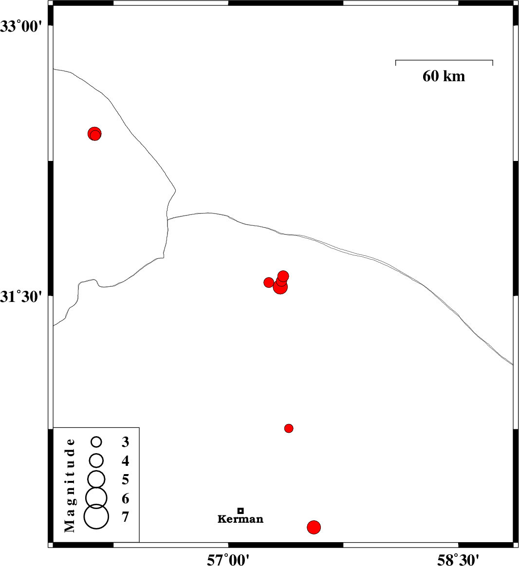 | 2022/10/21 | 13:47:07.3 | 17:17:07.3 | 31.609 | 57.357 | 12 | ML:3.2 | Kerman Province, 64 km North-East of Ravar | ||