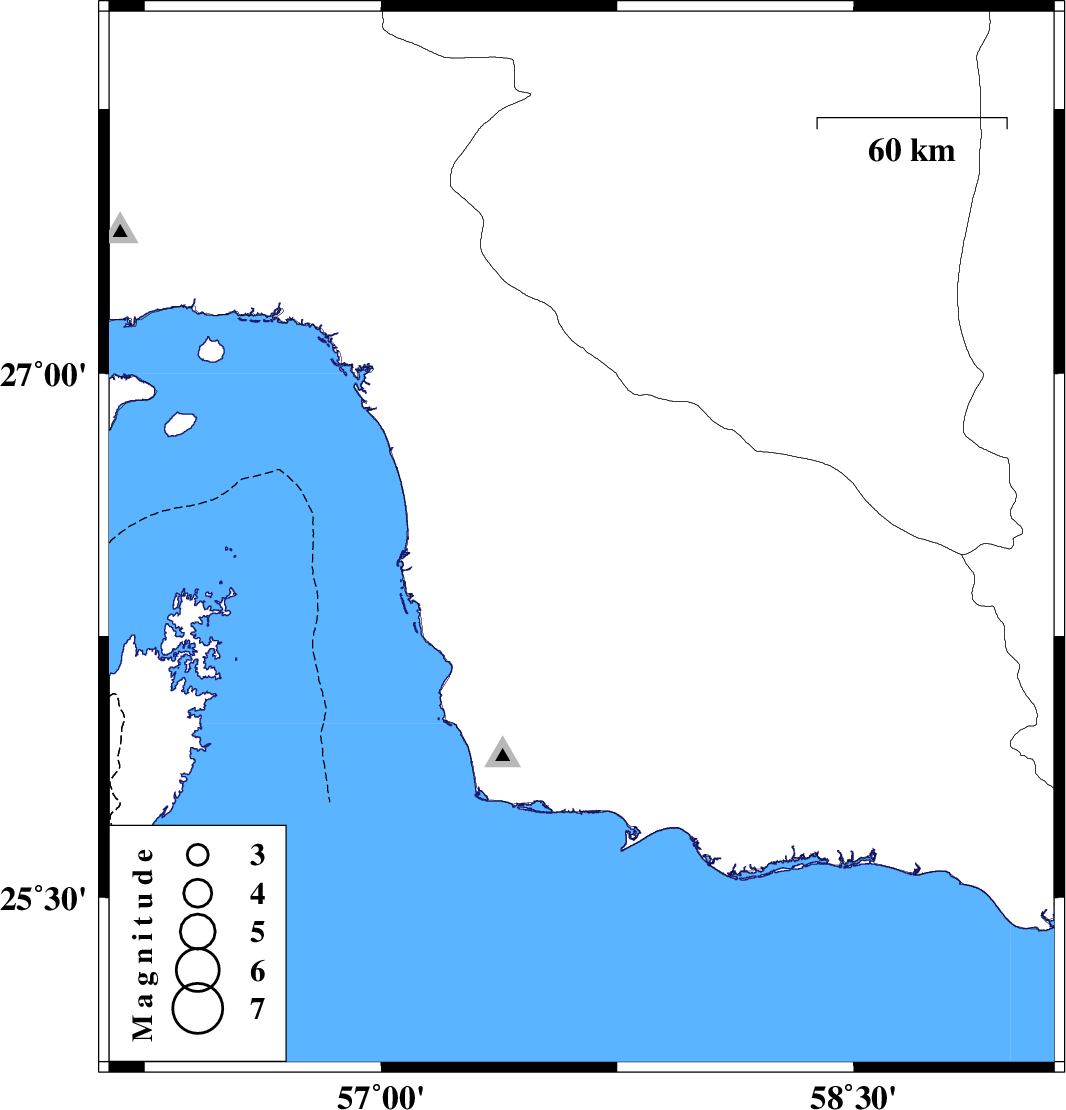 | 2022/10/25 | 02:19:07.0 | 05:49:07.0 | 26.526 | 57.637 | 12 | ML:3.5 | Hormozgan Province, 99 km South-East of Manujan |