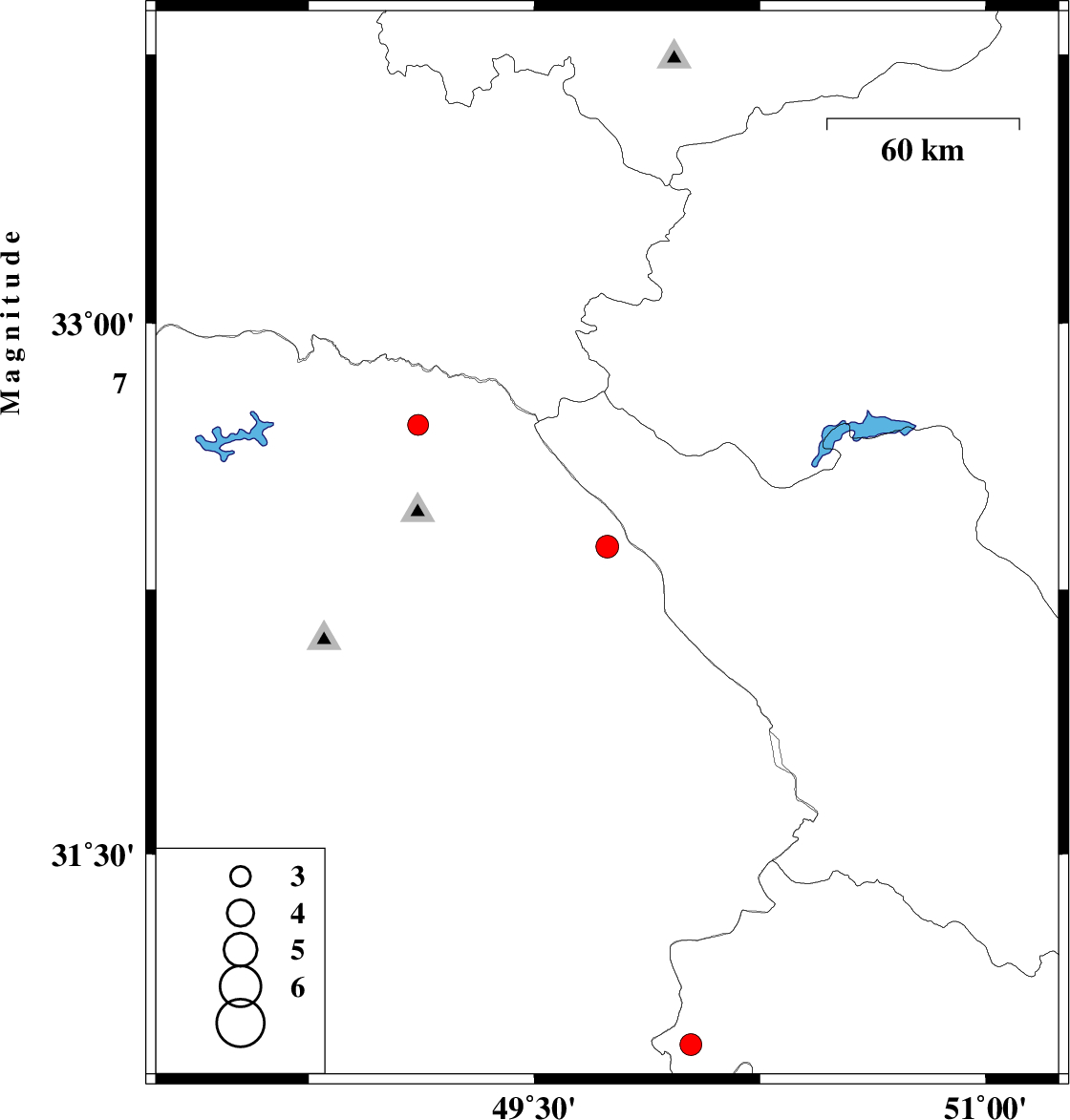 | 2022/10/28 | 09:30:50.2 | 13:00:50.2 | 32.714 | 49.114 | 10 | ML:3.1 | Khoozestan Province, 36 km North of Lali | ||