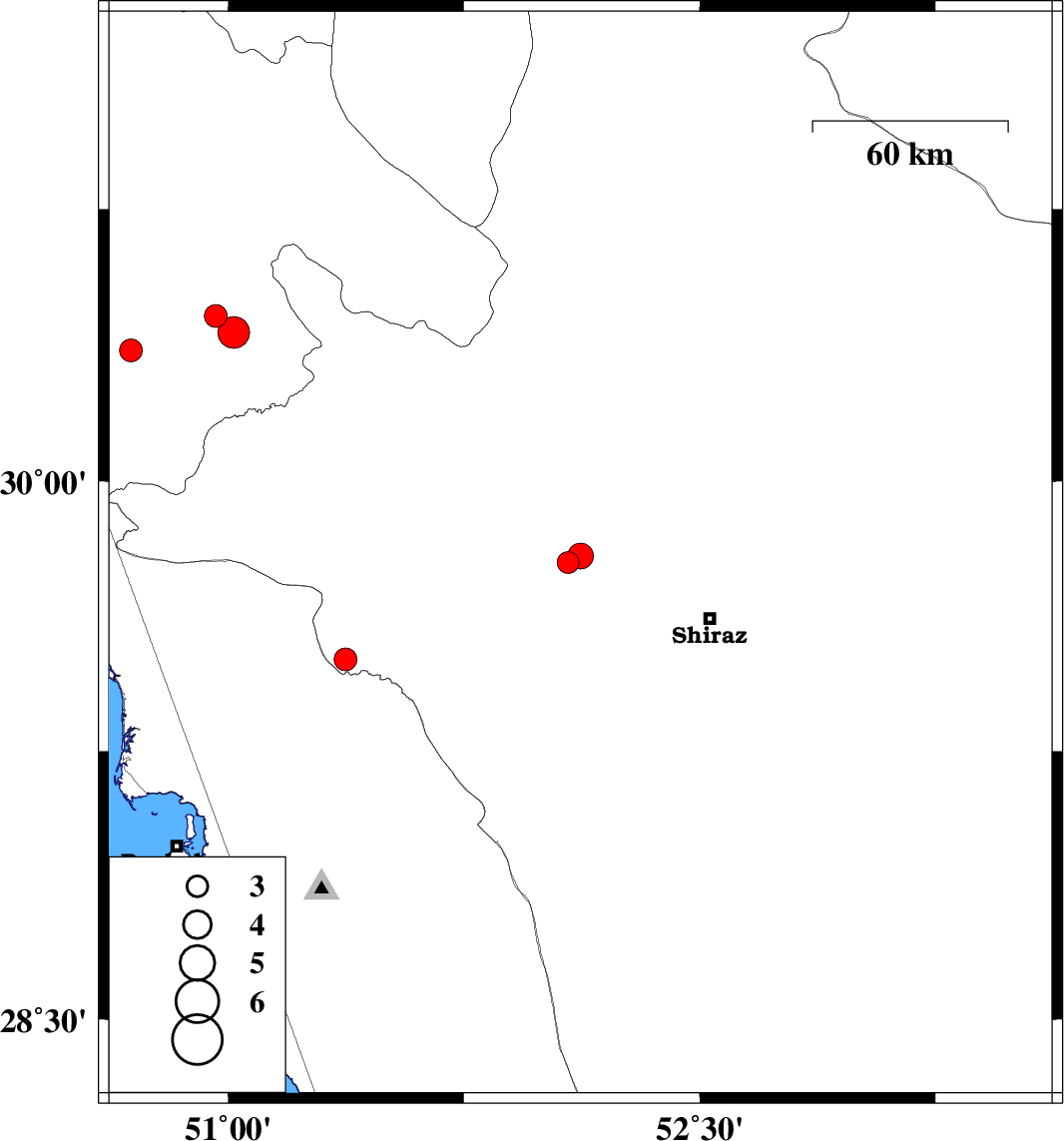 2022/10/29 | 15:56:47.0 | 19:26:47.0 | 29.793 | 52.121 | 17 | ML:3.6 | Fars Province, 44 km North-West of Shiraz | ||