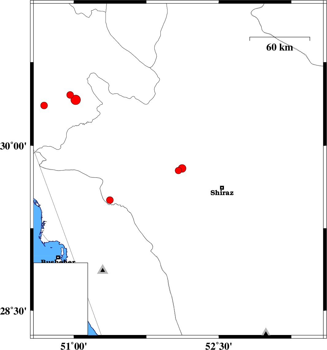 2022/10/02 | 05:15:10.5 | 08:45:10.5 | 29.506 | 51.373 | 12 | ML:3.3 | Fars Province, 30 km South-West of Kazerun |