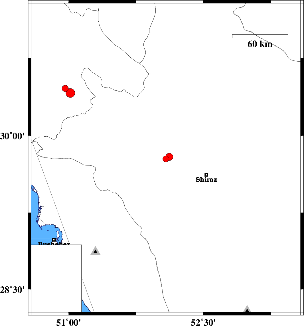 | 2022/10/29 | 15:56:47.0 | 19:26:47.0 | 29.793 | 52.121 | 17 | ML:3.6 | Fars Province, 44 km North-West of Shiraz | ||
