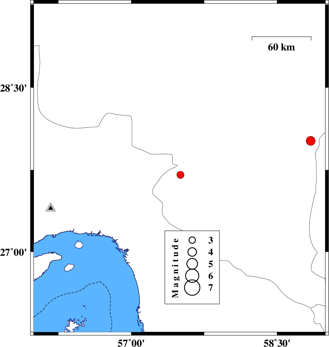 | 2022/11/03 | 03:28:32.3 | 06:58:32.3 | 27.851 | 57.649 | 12 | ML:3 | Kerman Province, 12 km of Kahnuj | ||