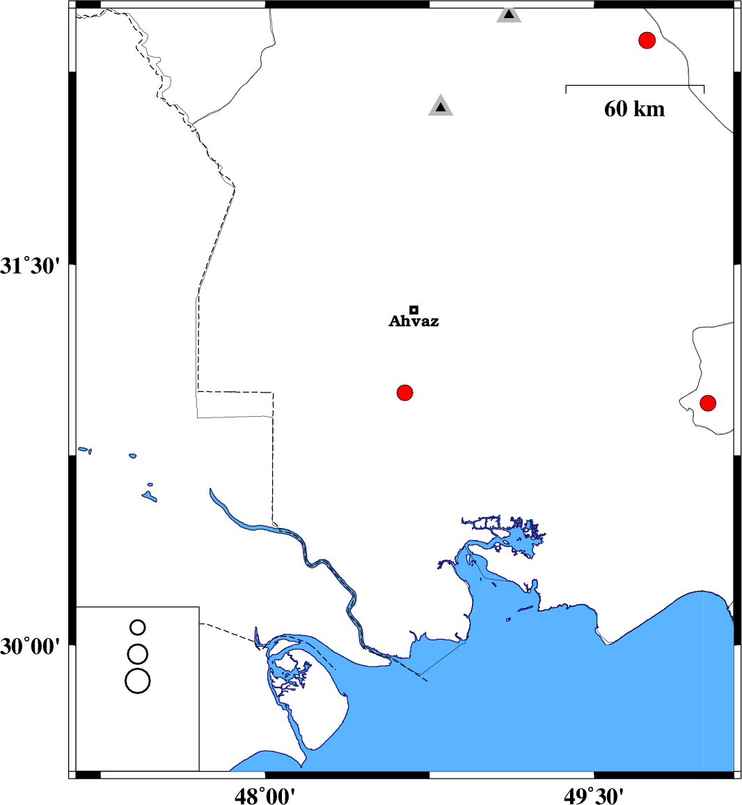 | 2022/11/04 | 14:04:15.4 | 17:34:15.4 | 30.997 | 48.637 | 12 | ML:3.3 | Khoozestan Province, 38 km North of Shadegan | ||
