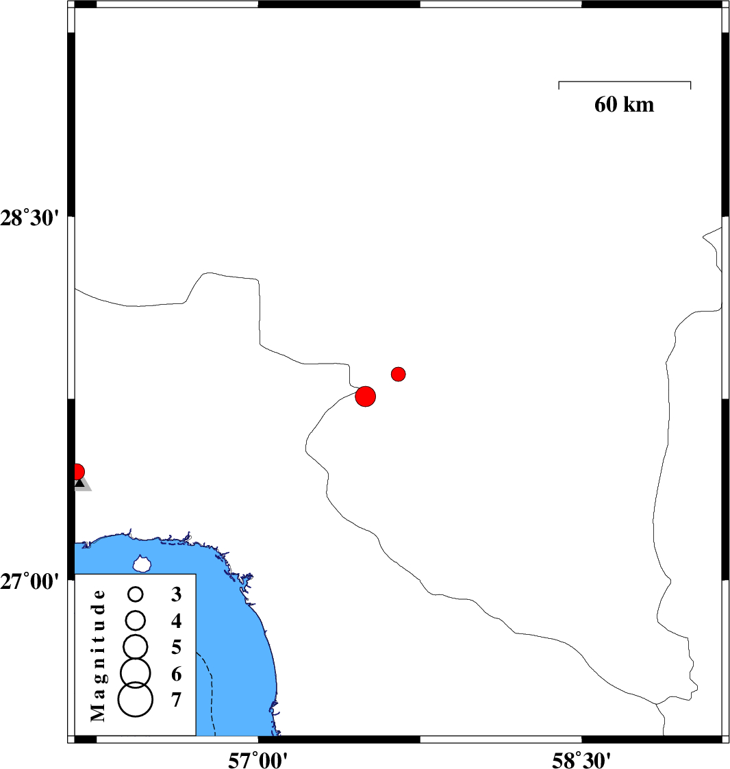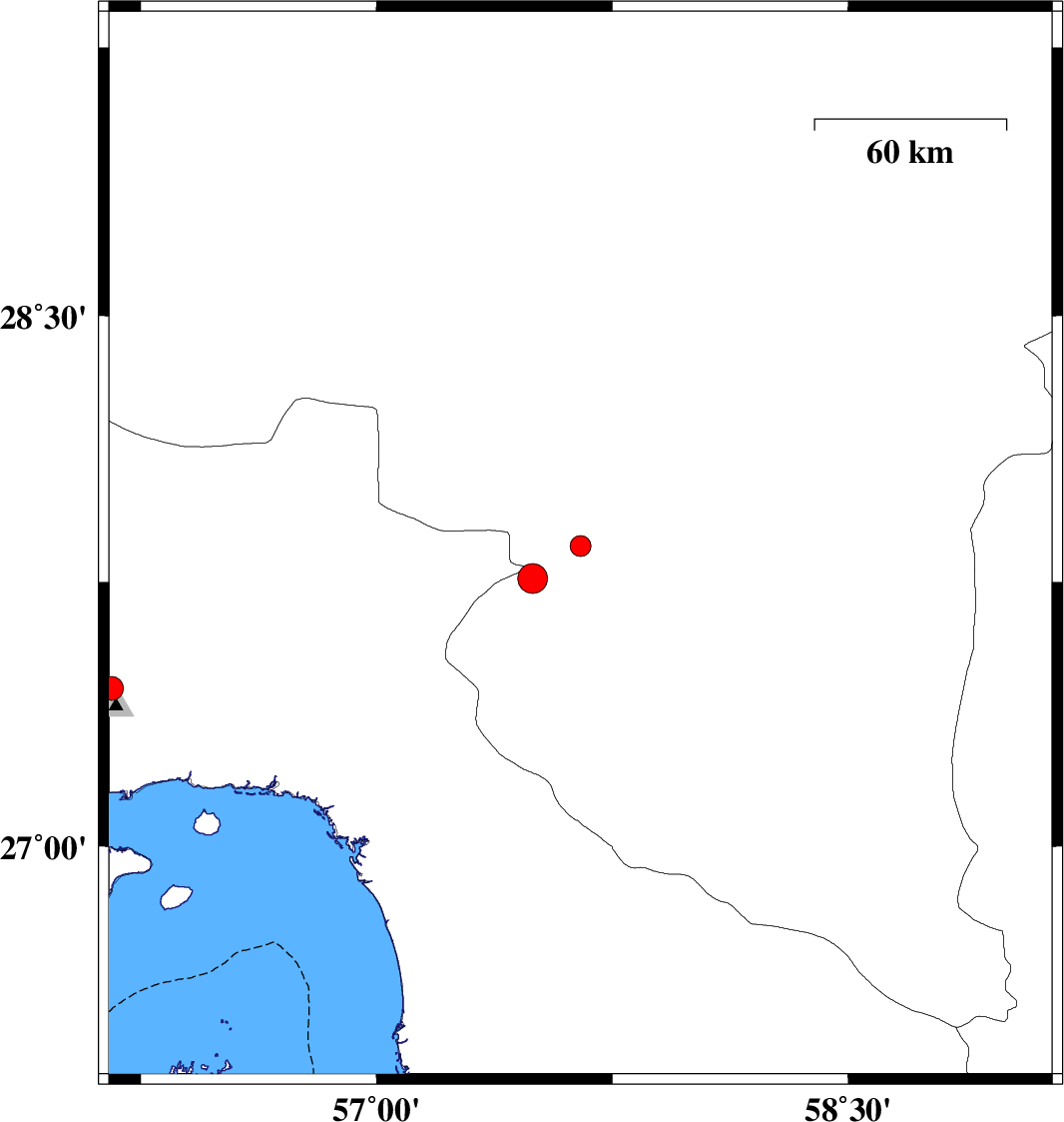 | 2022/11/03 | 03:28:32.3 | 06:58:32.3 | 27.851 | 57.649 | 12 | ML:3 | Kerman Province, 12 km of Kahnuj | ||
