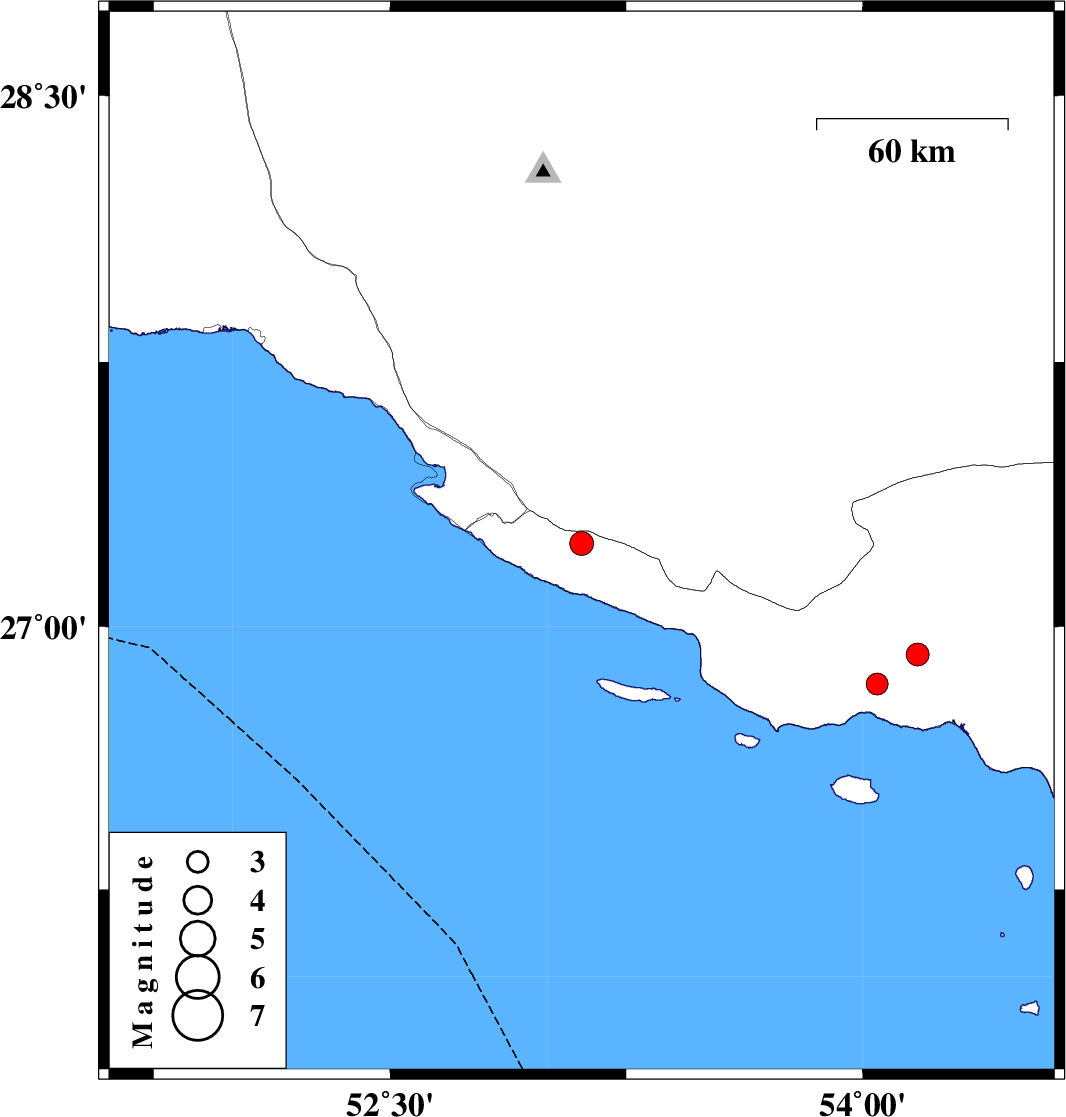 | 2022/10/26 | 13:26:59.6 | 16:56:59.6 | 26.836 | 54.046 | 12 | ML:3.1 | Hormozgan Province, 51 km South-West of Bastak |