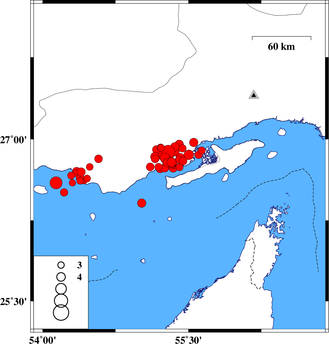 2022/07/01 21:53:22.8 02:23:22.8 26.73555.34312 ML:3.9 Persian Gulf, 54 km North-East of Bandar-e lengeh