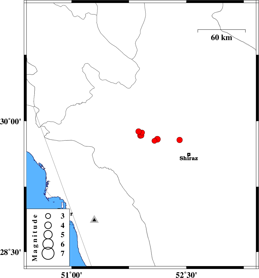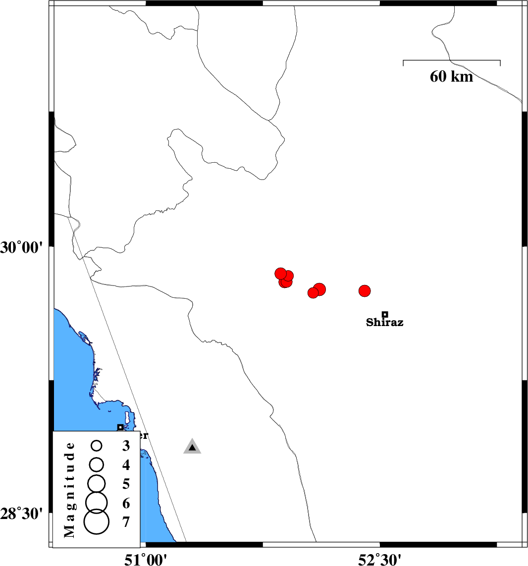 | 2022/10/31 | 01:12:28.6 | 04:42:28.6 | 29.784 | 52.412 | 16 | ML:3.4 | Fars Province, 22 km North-West of Shiraz | ||