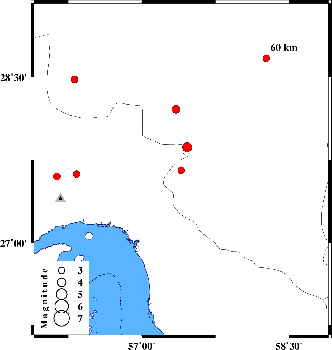 | 2022/07/01 | 14:04:21.1 | 18:34:21.1 | 27.868 | 57.462 | 12 | ML:4.4 | Kerman Province, 25 km -West of Kahnuj | ||