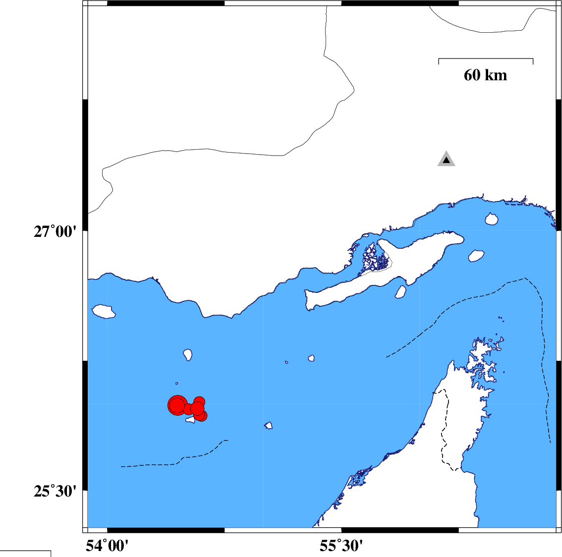 2022/11/30 | 19:51:26.1 | 23:21:26.1 | 26.747 | 55.385 | 16 | ML:3.3 | Persian Gulf, 59 km North-East of Bandar-e lengeh | ||