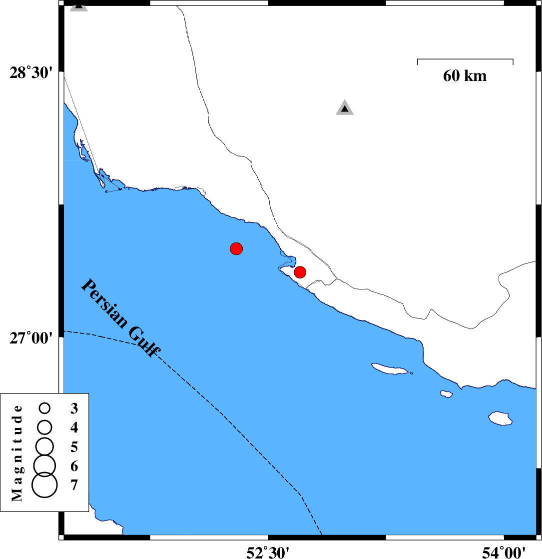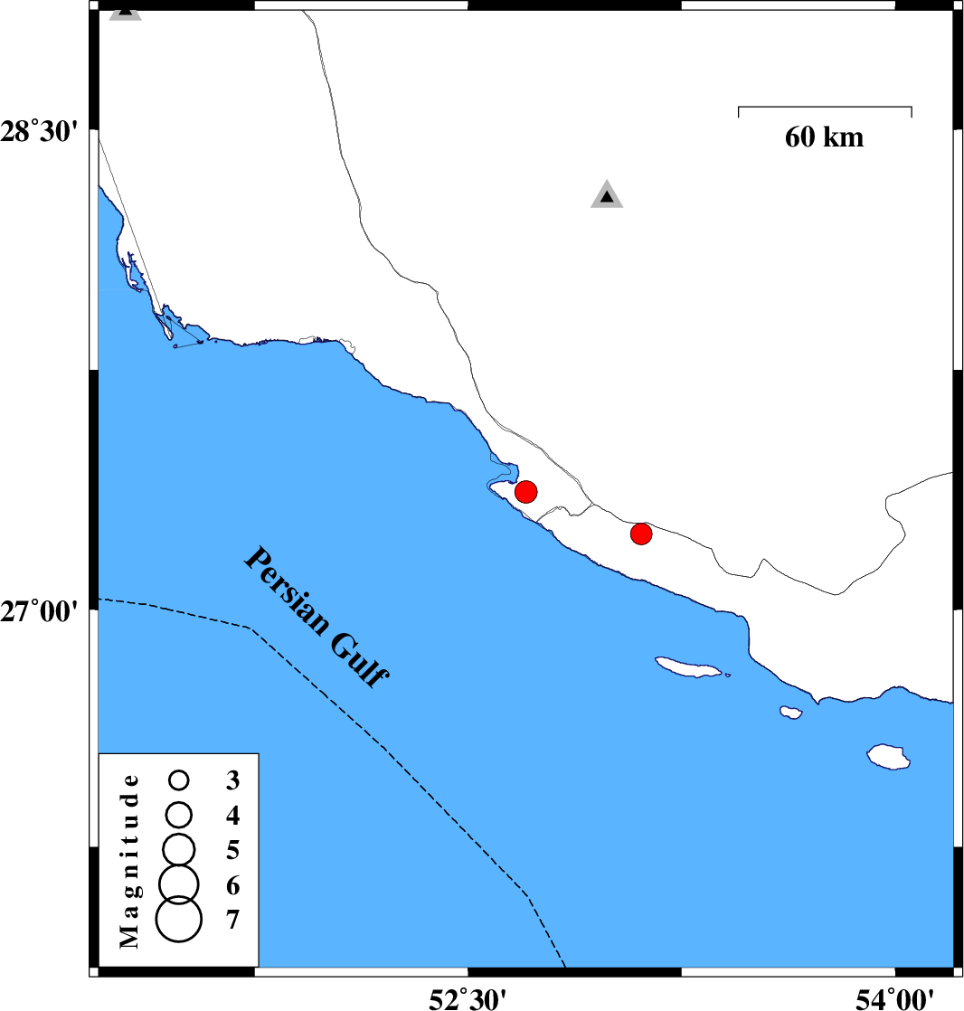 | 2022/12/02 | 03:12:33.6 | 06:42:33.6 | 27.369 | 52.703 | 16 | ML:3.5 | Bushehr Province, 27 km South-West of Mehr | ||