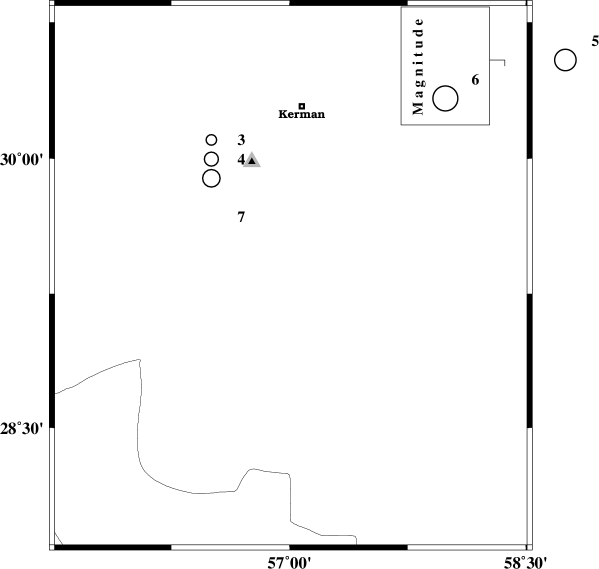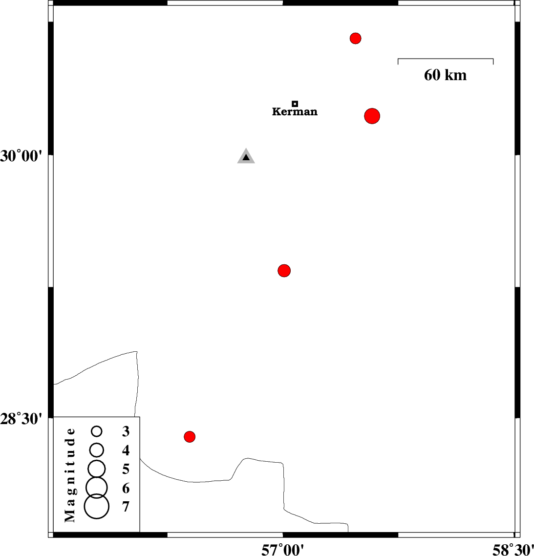 | 2022/11/12 | 22:48:02.7 | 02:18:02.7 | 30.219 | 57.58 | 12 | ML:4.5 | Kerman Province, 49 km -East of Kerman |
