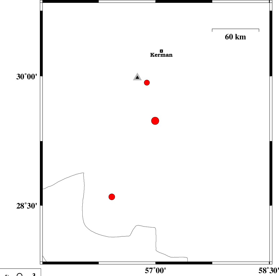 | 2022/11/27 | 23:08:04.6 | 02:38:04.6 | 28.392 | 56.394 | 7 | ML:3.2 | Kerman Province, 49 km -East of Hajiabad | ||