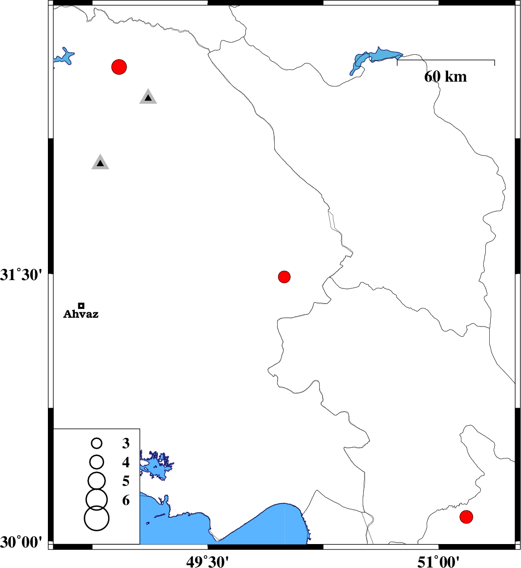 | 2022/12/11 | 08:05:59.1 | 11:35:59.1 | 32.644 | 48.923 | 10 | ML:4.4 | Khoozestan Province, 33 km North-West of Lali | ||