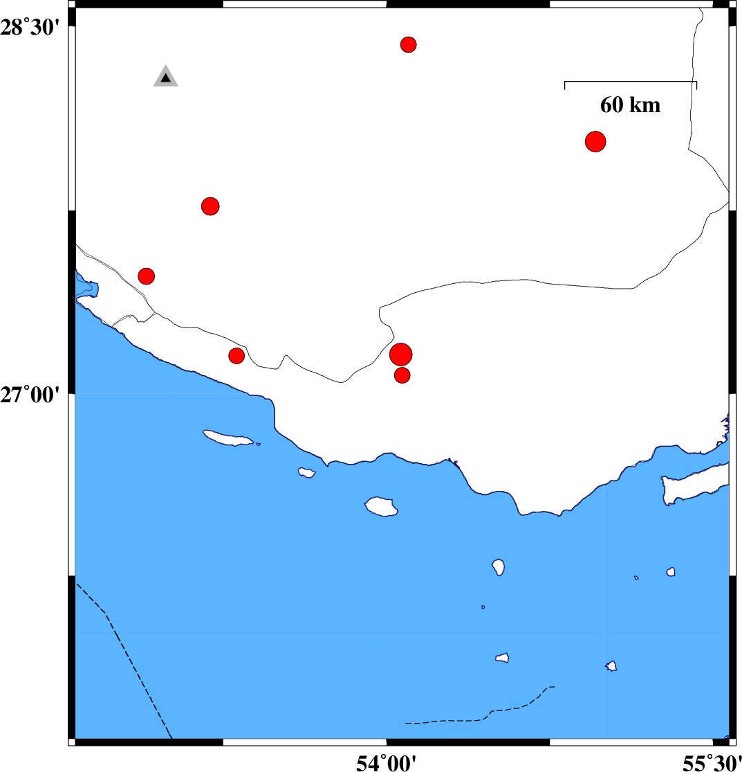 | 2022/05/04 | 06:34:47.4 | 11:04:47.4 | 28.031 | 54.96 | 19 | ML:4.2 | Fars Province, 73 km North-East of Lar |