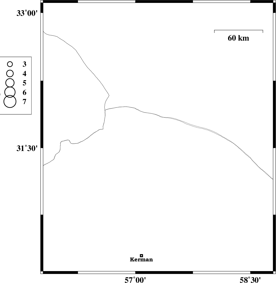 | 2022/12/21 | 09:02:20.1 | 12:32:20.1 | 31.611 | 57.296 | 7 | ML:3.9 | Kerman Province, 60 km North-East of Ravar |