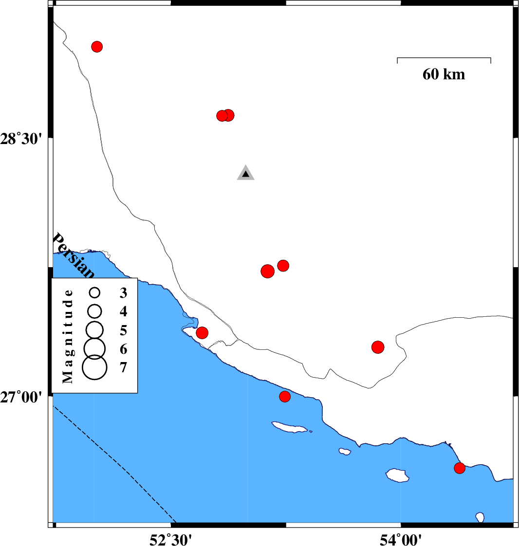 | 2022/12/02 | 03:12:33.6 | 06:42:33.6 | 27.369 | 52.703 | 16 | ML:3.5 | Bushehr Province, 27 km South-West of Mehr | ||
