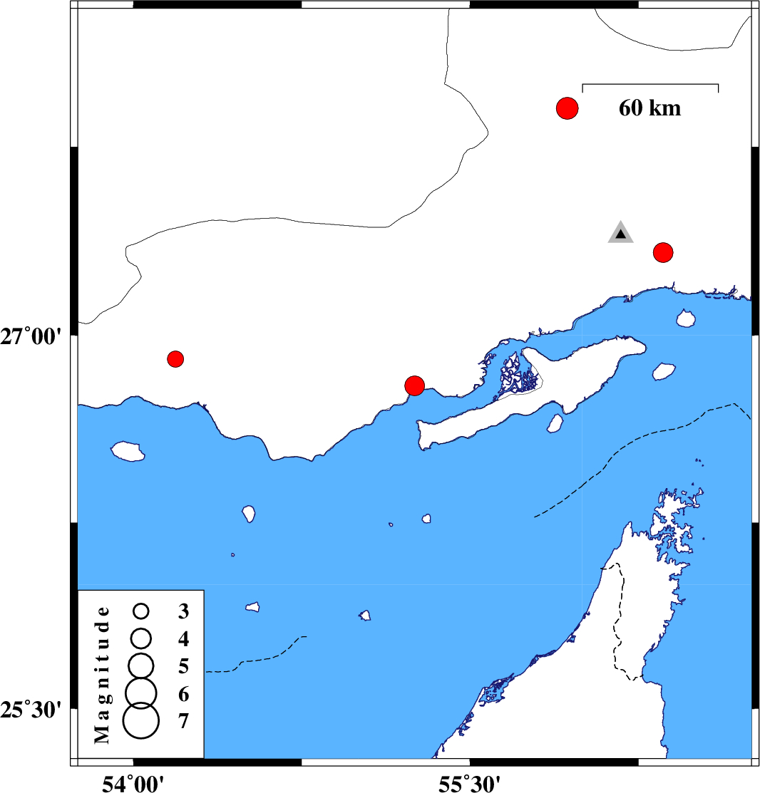 | 2023/01/04 | 16:19:58.4 | 19:49:58.4 | 26.798 | 55.253 | 12 | ML:4 | Hormozgan Province, 50 km North-East of Bandar-e lengeh | ||