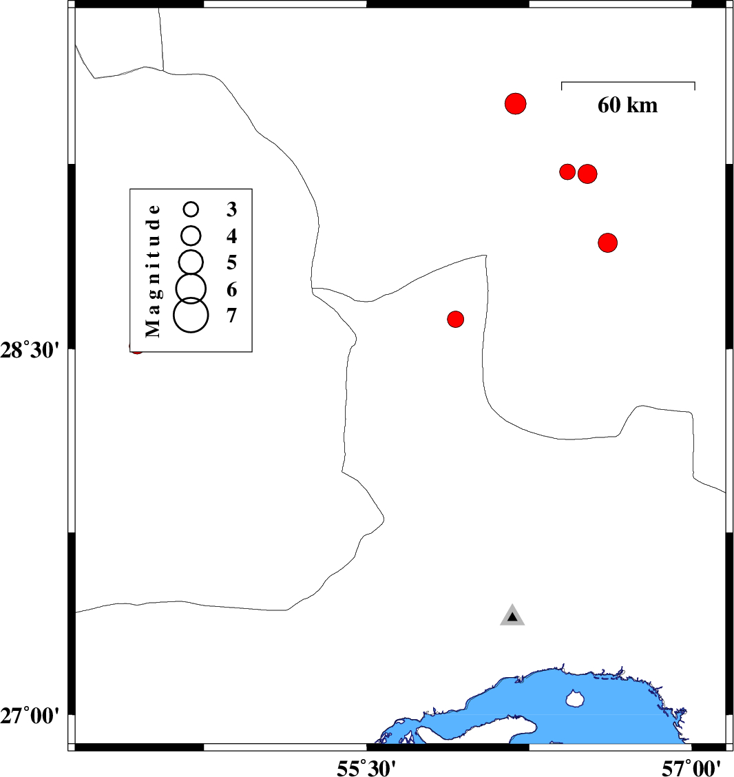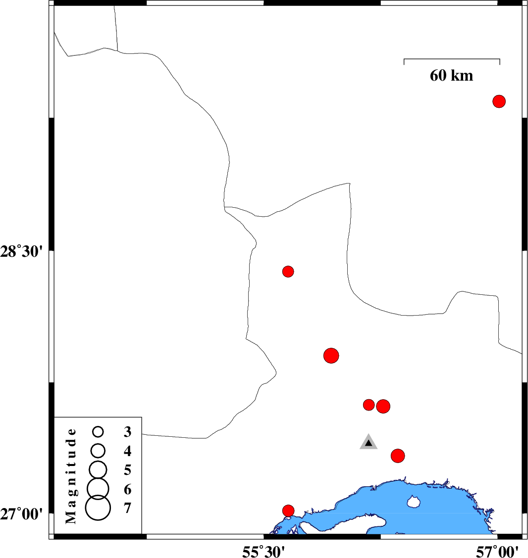 | 2023/01/05 | 21:46:26.5 | 01:16:26.5 | 28.381 | 55.656 | 12 | ML:3.3 | Hormozgan Province, 25 km -West of Hajiabad | ||